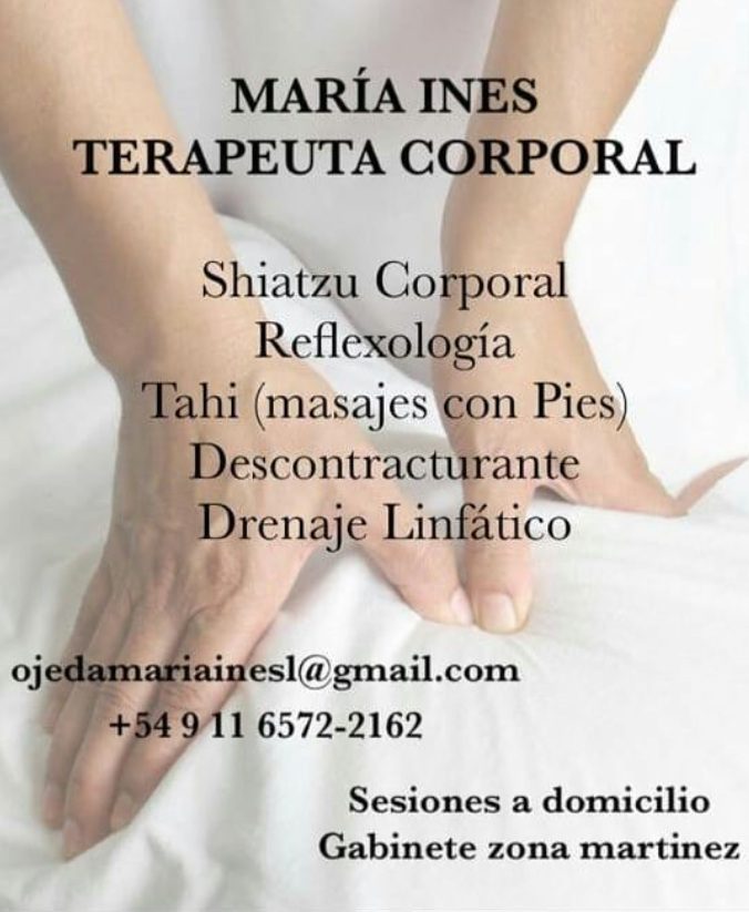 María Inés ofrece terapias corporales a domicilio en San Isidro, Martínez, Acassuso y Tigre, incluyendo Zen Shiatsu, masajes relajantes, reflexología, reflexología tailandesa, Thia (masajes con los pies), drenaje linfático y técnicas de relajación como Sotai. Cada sesión se adapta a las necesidades de la persona, buscando aliviar tensiones, mejorar el descanso y favorecer el equilibrio entre cuerpo y mente.